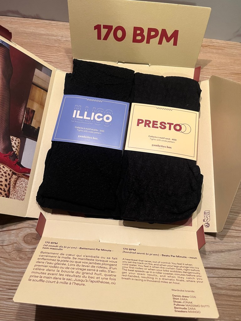 Thème du mois ? « illico, presto ! ». J’adore le fait que chaque mois il y a un petit jeu de mots avec les noms des deux collants.